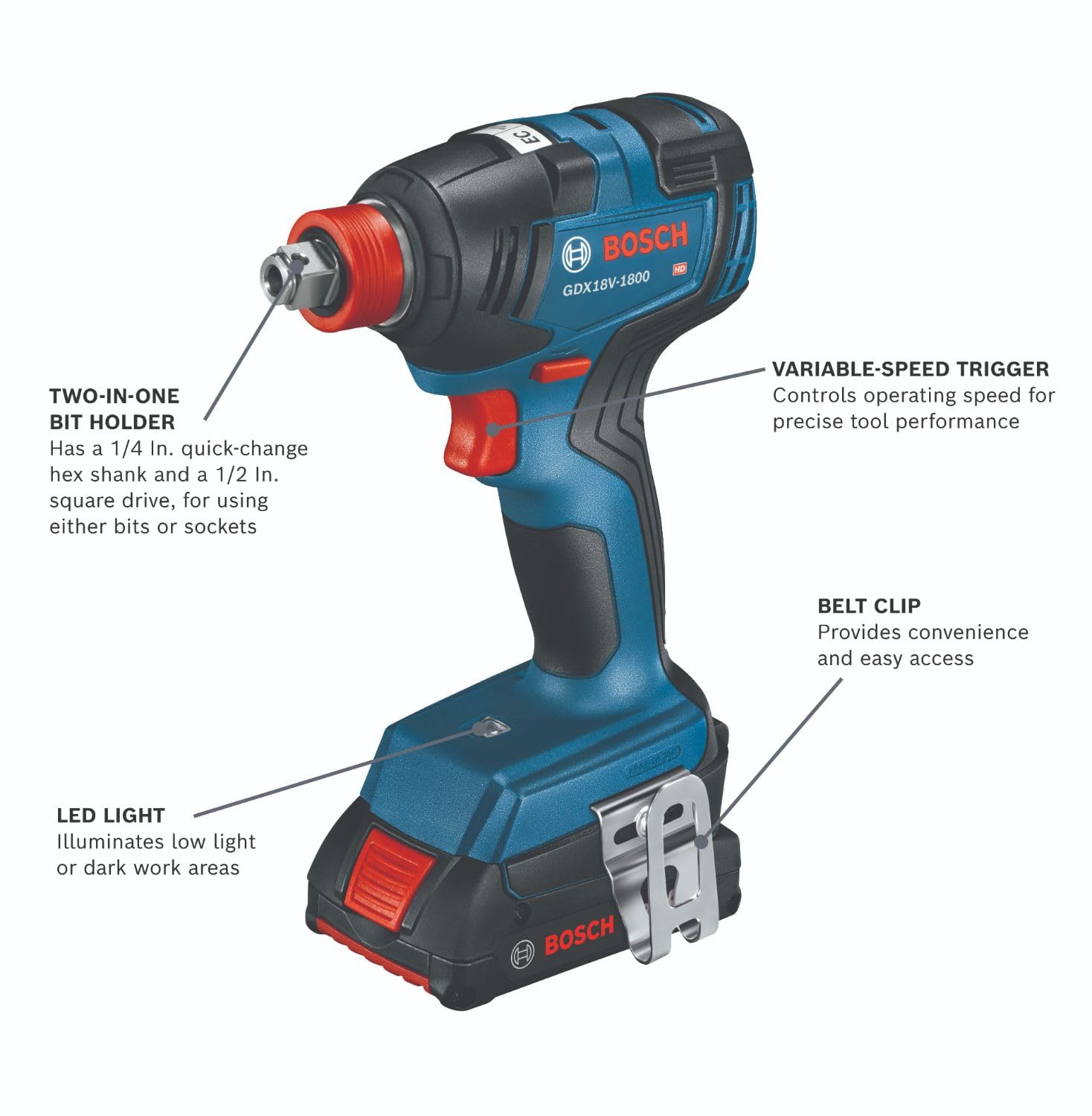 | Included Components | (1) GDX18V-1800 18V EC Brushless 1/4 In. and 1/2 In. Two-In-One Bit Socket Impact Driver (1) GSB18V-490 18V EC Brushless 1/2 In. Hammer Drill/Driver (1) CRS180 18V 1-1/8 In. D-Handle Reciprocating Saw (1) CCS180 18V 6-1/2 In. Circular Saw (1) GOP18V-28 18V StarlockPlus® Oscillating Multi-Tool (1) 1-1/4 In. Plunge Blade (1) GWS18V-8 18V 4-1/2 In. Brushless Angle Grinder with Slide Switch (1) GAS18V-02 18V Handheld Vacuum Cleaner (1) GBL18V-71 18V Blower (1) GLI18V-300 18V Articulating LED Worklight (2) GBA18V40 18V CORE18V Lithium-Ion 4.0 Ah Compact Batteries (1) 18V Charger (2) Belt Clips (2) Carrying Bags |