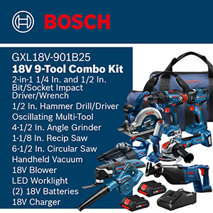 The Bosch GXL18V-901B25 Nine-Tool Kit is the all-in-one way to unleash cordless performance – all on Bosch’s 18V tool platform. Included is the GDX18V-1800 two-in-one cordless impact driver/wrench for use with bits and sockets. It does two jobs with one tool and goes from impact wrench to impact driver fast. The GSB18V-490 1/2 In. Hammer Drill/Driver is engineered for tough applications (such as metal or masonry), providing 490 In.-Lbs. of torque. The Bosch CRS180 Reciprocating Saw delivers an efficient 1-1/8 In. stroke with up to 2,700 SPM. The CCS180 circ saw’s ergonomic main handle and auxiliary handle make it comfortable to use for extended periods. The kit also features the GOP18V-28 StarlockPlus® Oscillating Multi-Tool for versatility, the GWS18V-8 4-1/2 In. angle grinder for grinding and metal cutting, the GAS18V-02 Handheld Vacuum Cleaner, the GBL18V-71 Blower, the GLI18V-300 worklight, two carrying bags, two CORE18V® 4 Ah Compact Batteries and an 18V charger.
