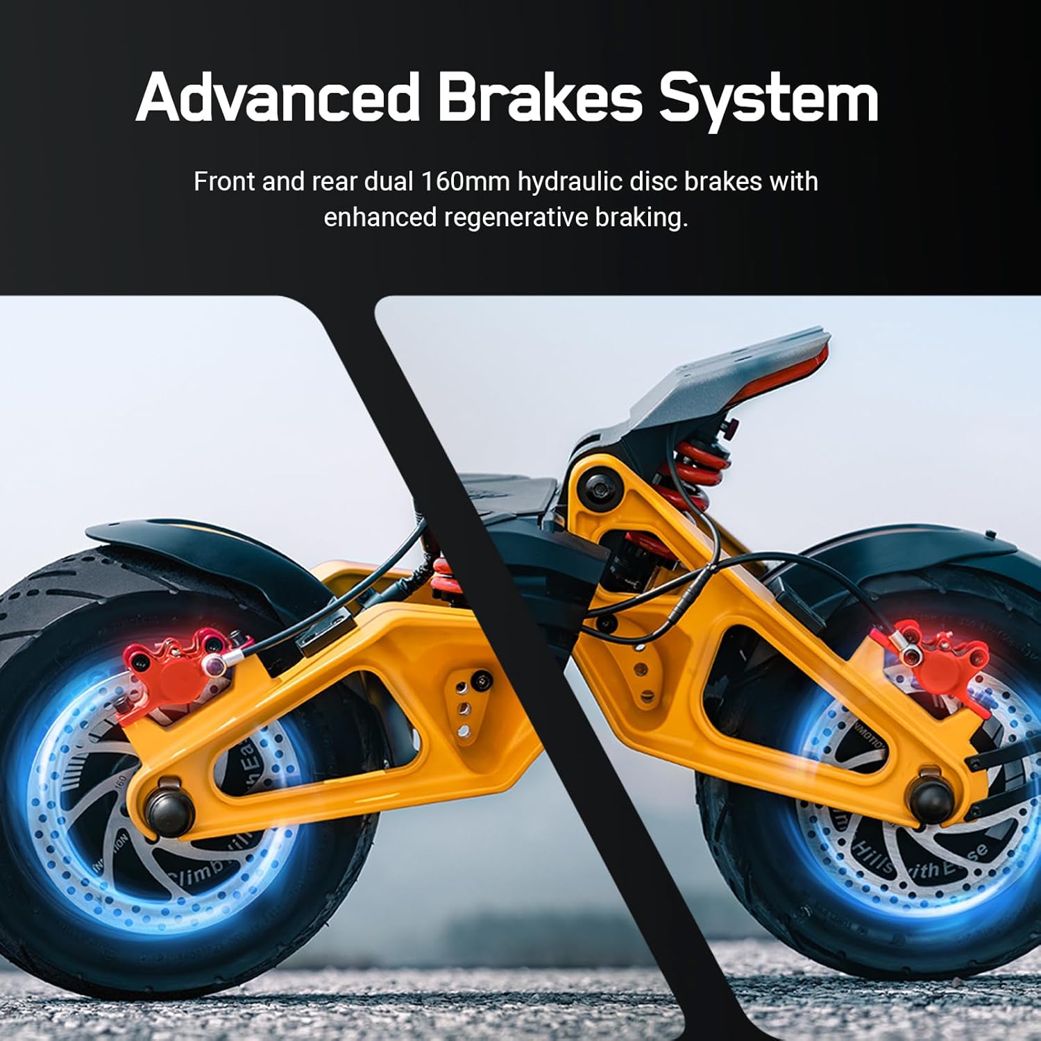 - Advanced Safety Brakes: Dual 160mm full-hydraulic disc brakes and regenerative braking in front and rear wheels. Halt swiftly even at high speeds, ensuring total control and safety always