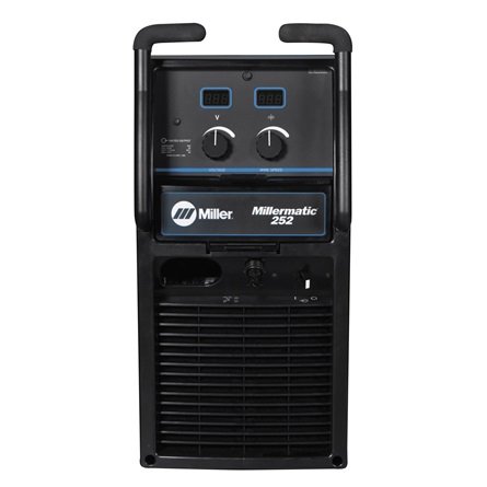 MIG Welder, Millermatic 252, Welding Processes MIG/Flux Core, Input Voltage 200 (208)/230VAC, Welded Material Mild Steel, Aluminum, Material Thickness Mild Steel 22 ga. to 1/2 In., Portability Wheeled Mounted, 1 Phase, Material Thickness Aluminum 14 ga. to 3/8 In., Rated Output 200A@28VDC, Duty Cycle 60 Percent, 60 Hz, 48/42A Input Amps, Output Range 30 to 300A DC, Wire Size 0.023 In. to 0.045 In./Flux 0.030 to 0.045 In., Overall Height 30 In., Overall Width 19 In., Overall Depth 40 In.