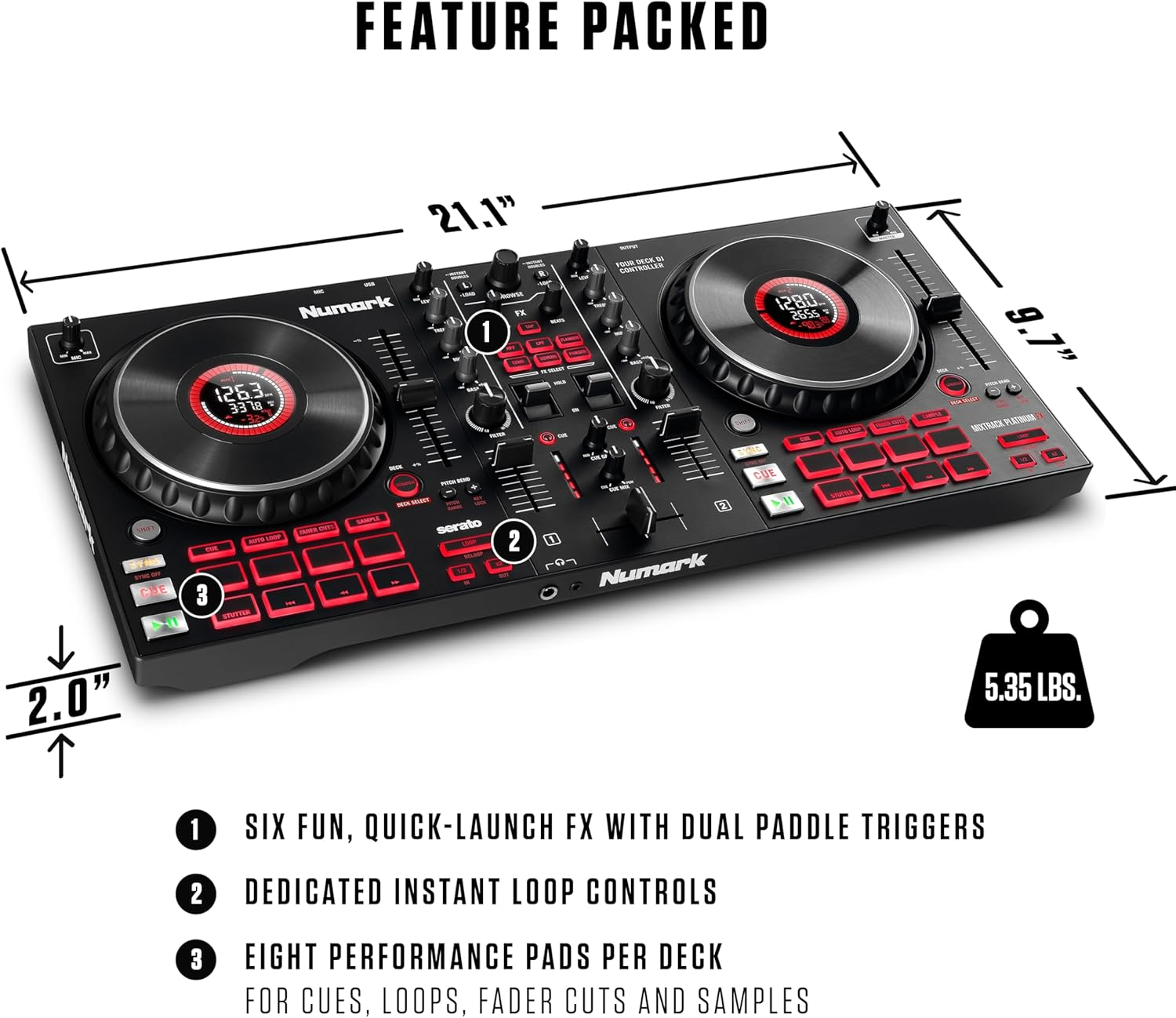 Center stage on Mixtrack Platinum FX are two all-new premium paddle triggers for effortless command over Serato’s built-in software FX; there’s even quick-access buttons to core FX including Echo, Reverb, Flanger, Phaser, HPF (High Pass Filter) and LPF (Low Pass Filter) – a sure fire guarantee that everything you need for creating build ups, crafting unforgettable transitions and adding your own unique spin to your mix is only a touch away!